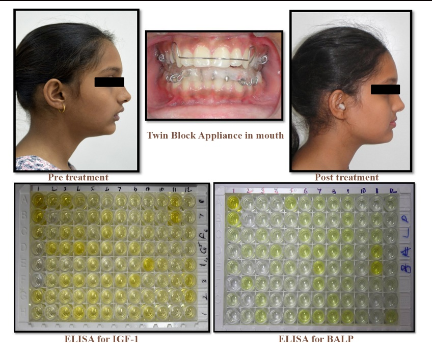 The aim of the study is to assess the changes in levels of salivary IGF-1 and BALP following twin block therapy. This observational study was proposed to be conducted on a minimum 40 subjects having Angle’s Class II division 1 malocclusion with retrognathic mandible in the age group of 10-14 years. Twin block therapy will be started in all the subjects and non compliant subjects will be taken as controls. Unstimulated salivary samples will be collected at various time points for estimation of IGF-1 and BALP by ELISA. The skeletal, dental and soft tissue changes before and after the use of twin block appliance along with condylar changes will be assessed on lateral cephalogram taken at different intervals.